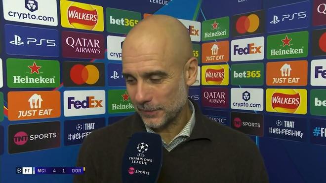 率队在欧冠联赛阶段第4轮主场4-1大胜多特蒙德之后,曼城主教练瓜迪奥拉接受了来自TNT体育的采访。