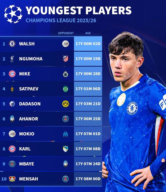 本赛季欧冠最年轻出场球员前10:切尔西小将雷吉-沃尔什第1